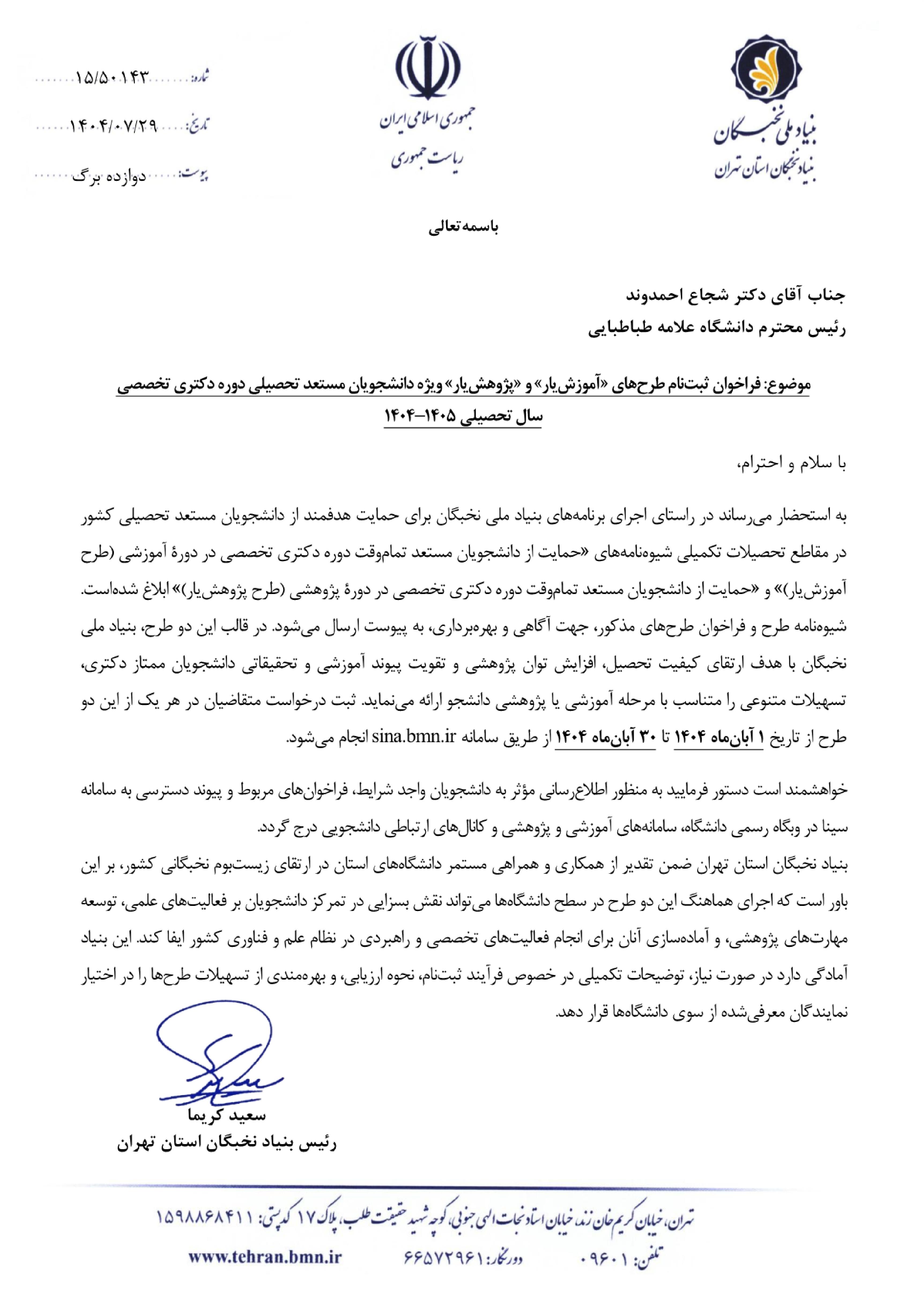 اطلاعرسانی فراخوان طرحهای «آموزشیار» و «پژوهشیار» بنیاد ملی نخبگان ۰۶ آبان ۱۴۰۴ | ۰۷:۴۷ کد : ۳۰۴۷۴ آموزش تعداد بازدید:۱۲ دانلود (آموزشیار) دانلود (پژوهش یار)